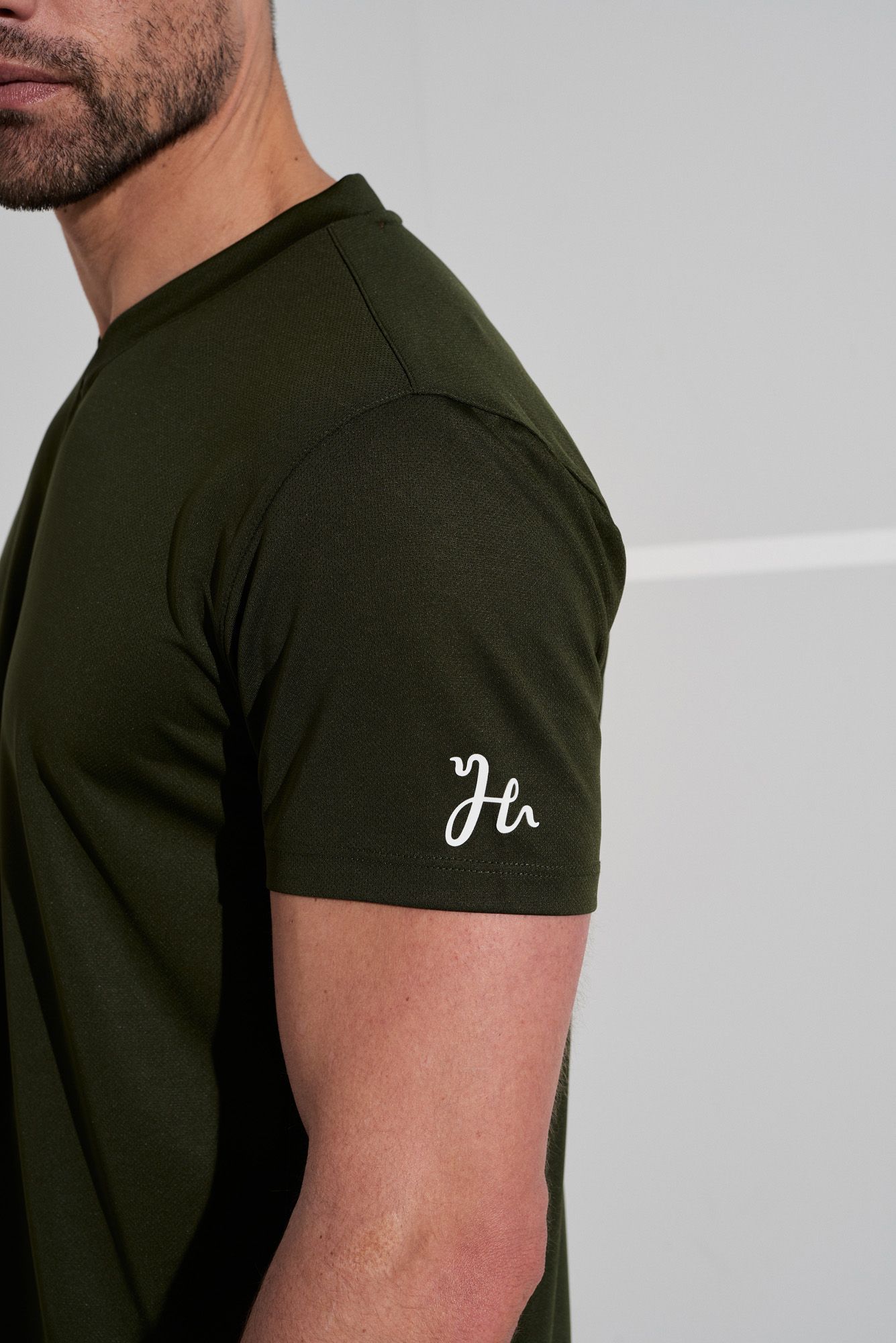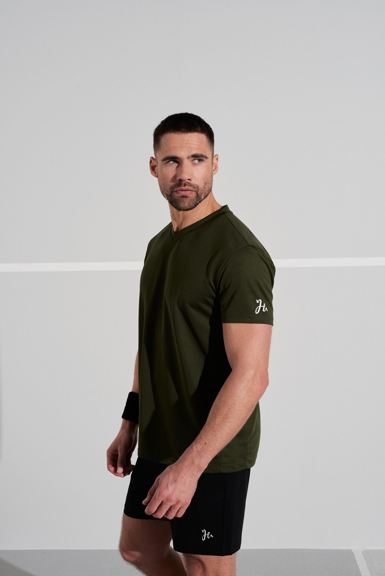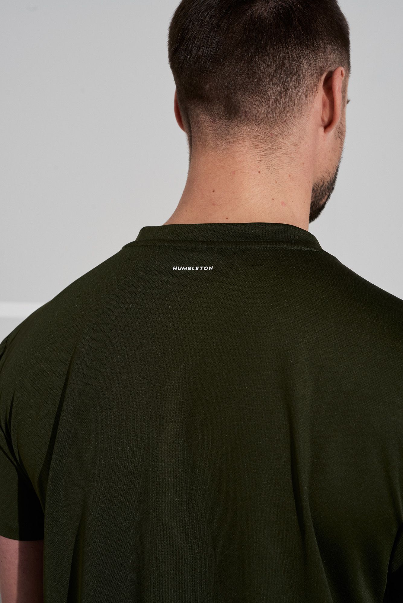 En v-ringad t-shirt tillverkad i Humbletons lättviktsmaterial Quick Dry PX Jersey med liten printad logo på ärmen.