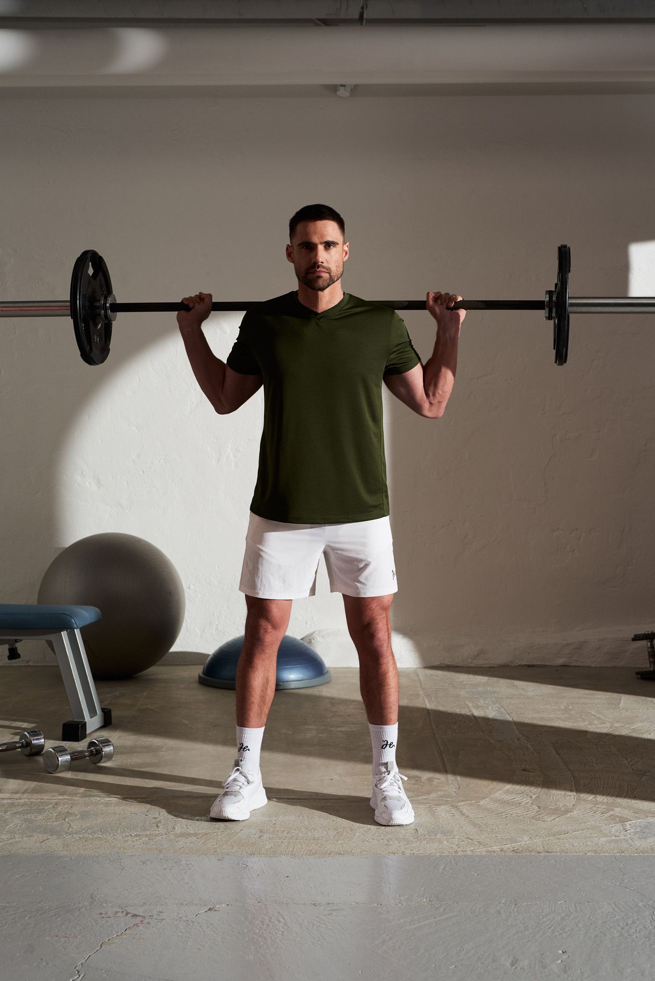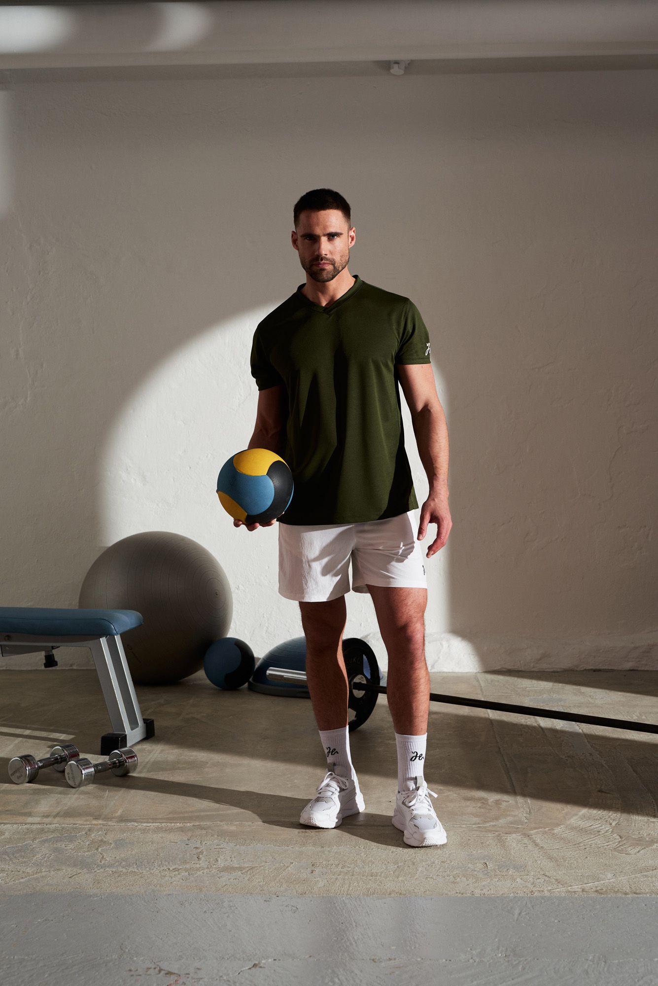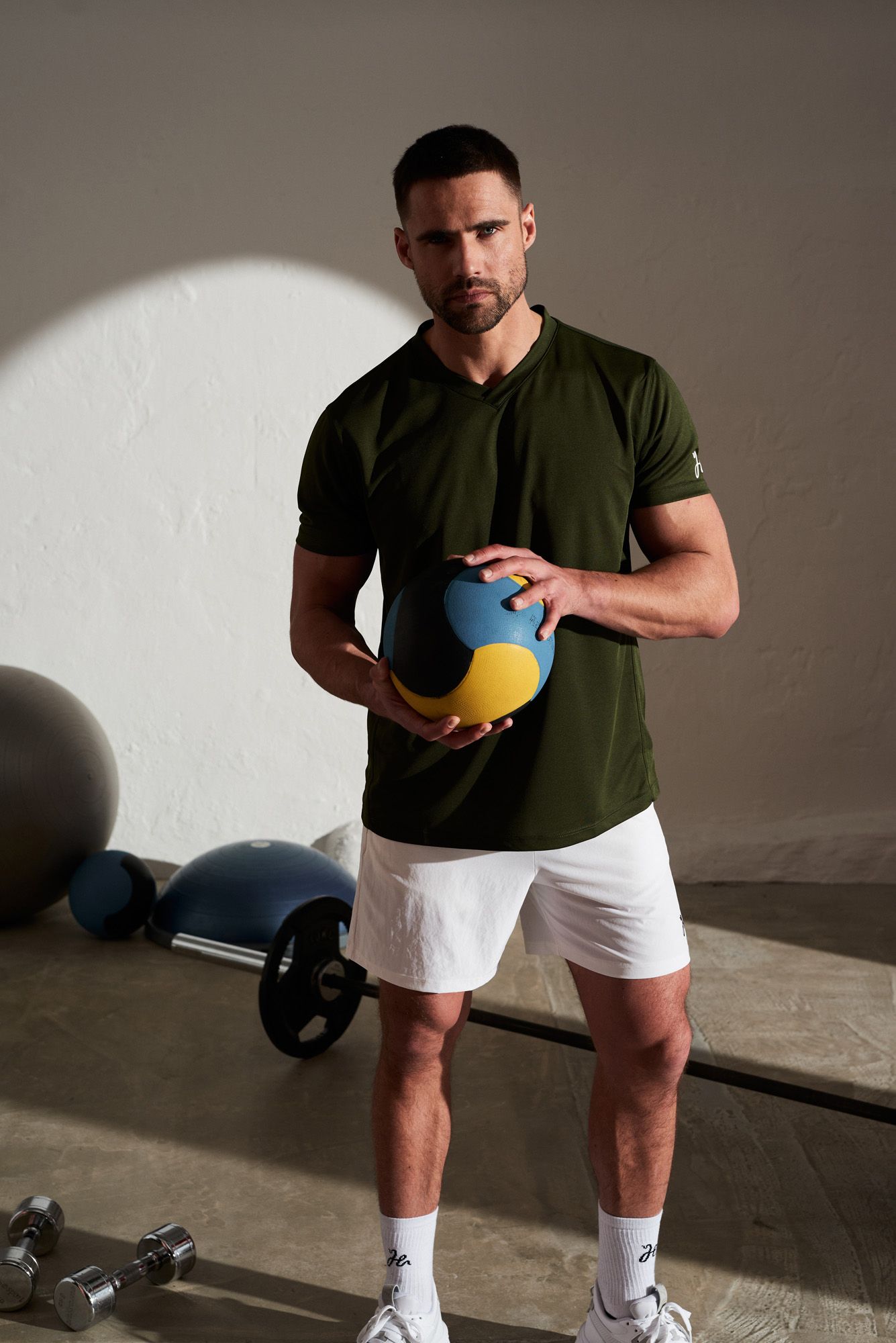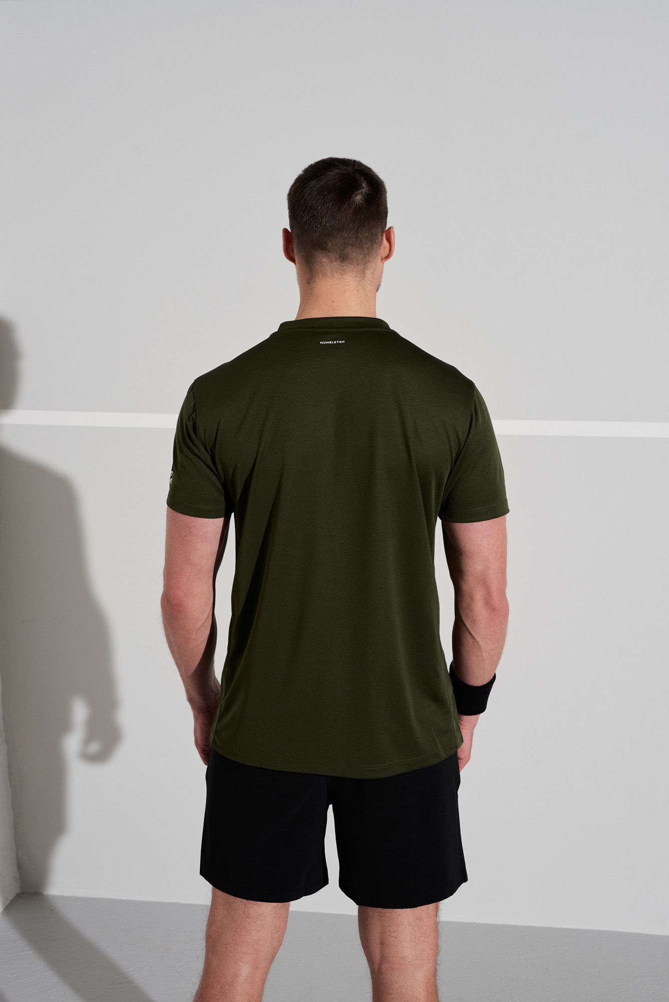 En v-ringad t-shirt tillverkad i Humbletons lättviktsmaterial Quick Dry PX Jersey med liten printad logo på ärmen.