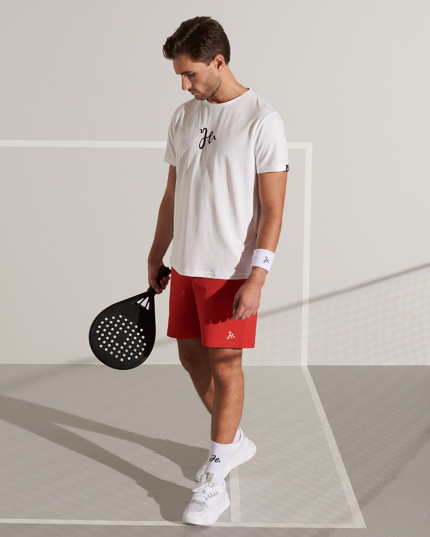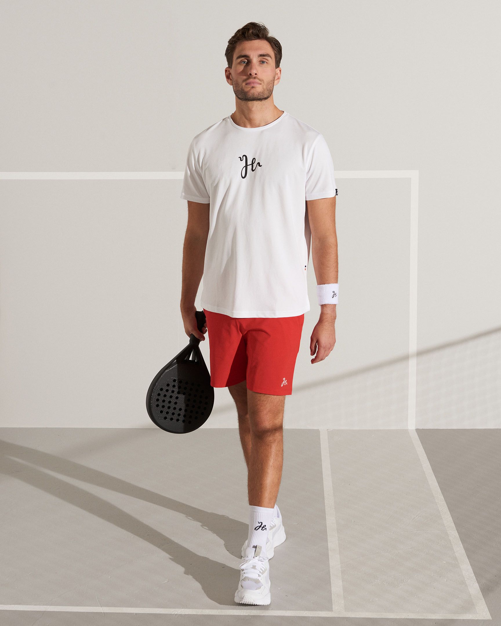 Modellen är 187cm och bär Large på överdelar och Medium på shorts/byxor.